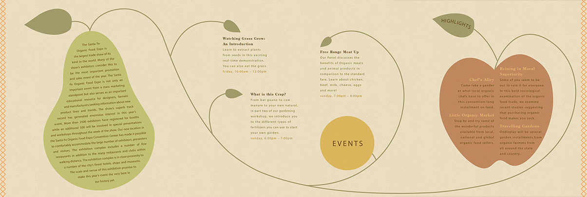 Materials for a fictional organic foods expo in Santa Fe. Trifold and Poster.